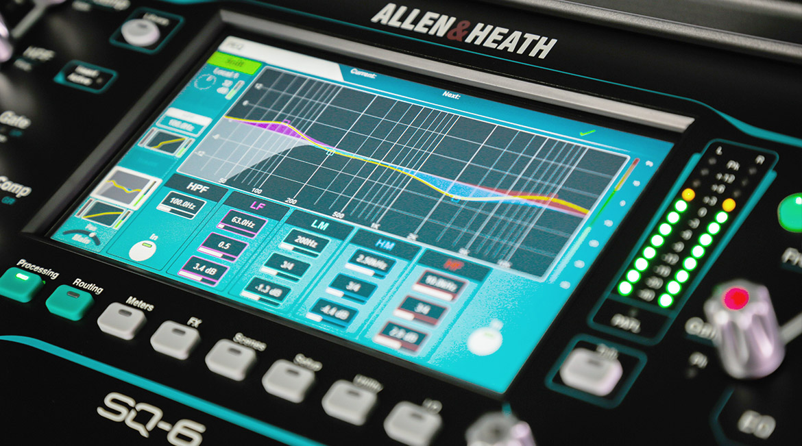 With each new design, the Allen & Heath team strives to get closer to the ultimate mixing experience. SQ’s dashboard is centred around a high-res 7” capacitive touchscreen, framed by an array of high-grip, illuminating encoders to create an intuitive, integrated blend of clear visual feedback and immediate, hands-on control. Channels and mixes can be dragged and dropped to any strip, with custom naming and colour coding on the colour strip displays, allowing you to build a mixing environment that mirrors your own workflow. Each strip features our patented Chromatic channel metering system, giving you at-a-glance level indication thanks to LEDs with variable brightness and colour. SQ-6 also offers 16 Softkeys and 4 Soft Rotaries with displays that can be assigned to the functions you want at your fingertips, and a ‘channel to all’ mix button to instantly access all sends from the selected channel.