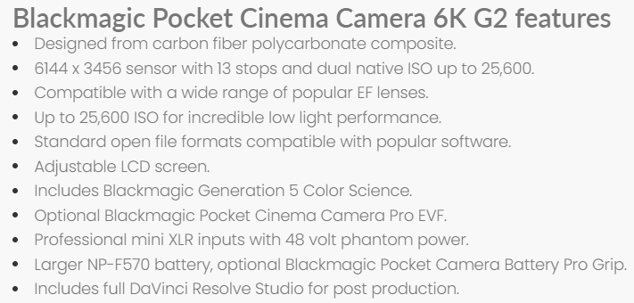 Featuring a larger 6144 x 3456 Super 35 sensor and EF lens mount, the Blackmagic Pocket Cinema Camera 6K G2 lets customers use larger EF photographic lenses to create cinematic images with shallower depth of field, allowing creative defocussed backgrounds and gorgeous bokeh effects.