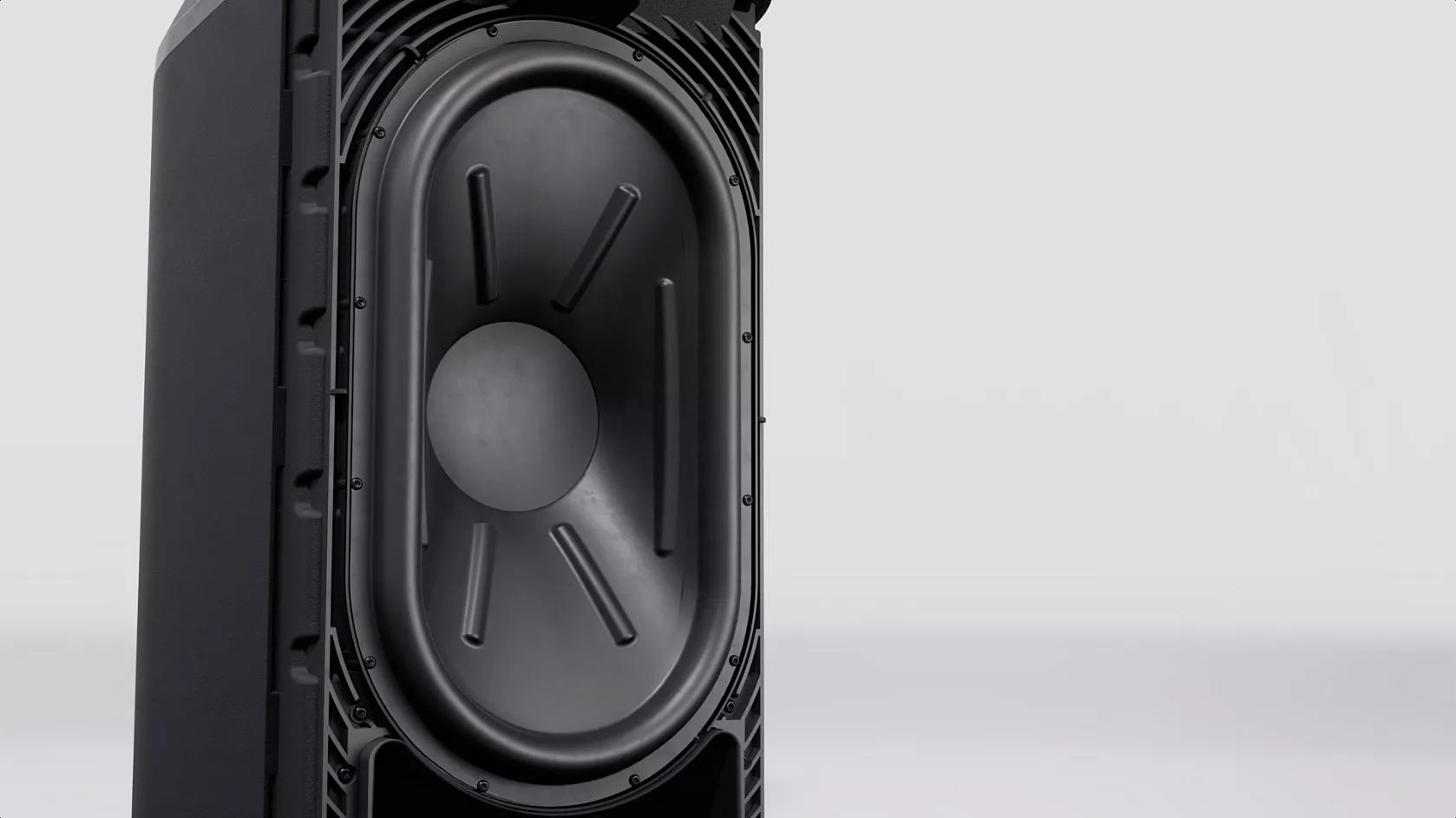 An integrated subwoofer with a unique RaceTrack driver design gives you powerful bass, has an optimized center of gravity, and saves a lot of space. This slim 10"x 18" neodymium driver gives you performance that rivals a conventional 15" woofer without the cumbersome size, freeing up room in your vehicle and on the stage, and making every carry in between — home to car, vehicle to venue — much easier.