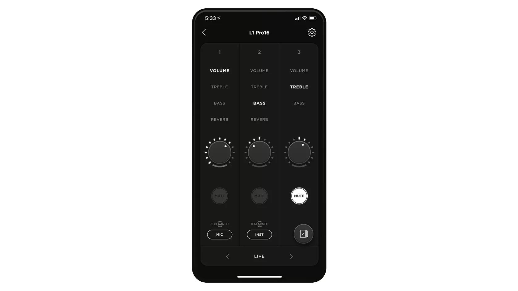 With the Bose Music app, you can adjust mixer settings instantly from your mobile device or even walk the room, hear how the mix sounds, and fine-tune as you go. Change volume and tone settings in the app and watch the LED encoder on your L1 Pro move to match — the mixer and app are always in sync, in real time. Plus, you have access to the entire ToneMatch library of custom EQ presets. With the Bose Music app, you get the connectivity that empowers your performance, giving you greater flexibility for on-the-fly tweaks via controls that are intuitive and instant.