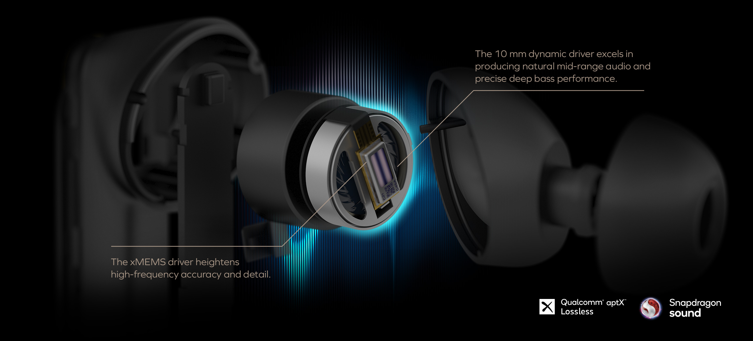 Coupled with Qualcomm for the integration of Snapdragon Sound's aptX Lossless technology, the audio codec delivers hi-fidelity audio at 16-bit / 44.1 kHz, providing a CD-level experience that faithfully recreates the original recording right in your ears.