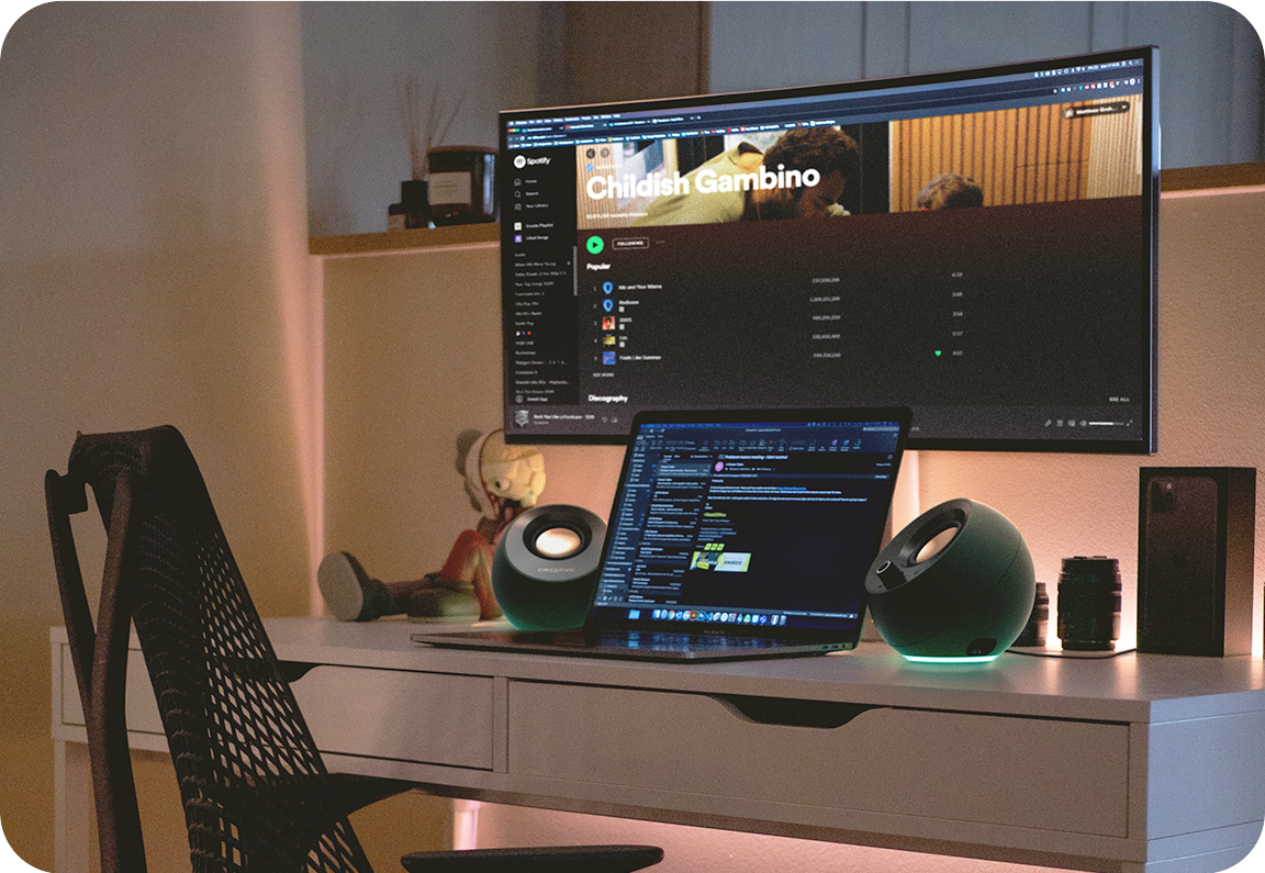No subwoofer, no problem. Featuring our BassFlex technology, Creative Pebble Pro is more than capable of delivering extended low frequency response and pronounced bass, even when the volume is low.