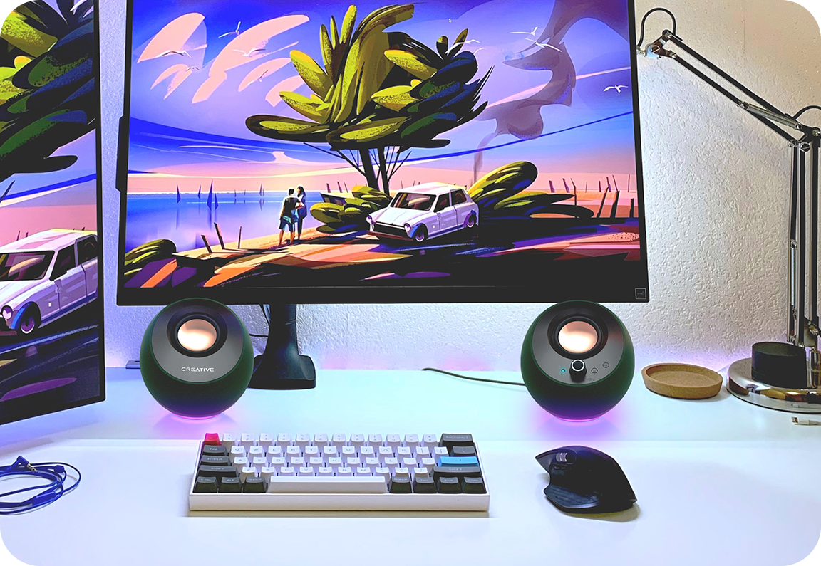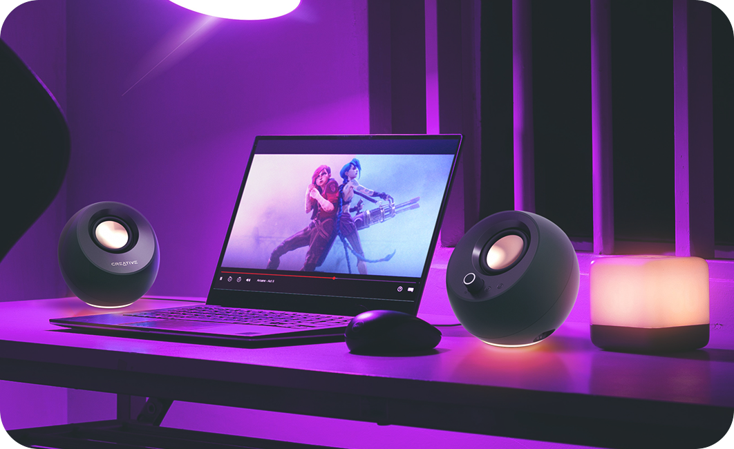 Choose from a range of RGB LED lights and 3 lighting effects, and create a setup that fits your desktop aesthetics. Creative Pebble Pro's RGB lights let you cycle through a spectrum of colors, get groovy with pulsate mode, or even keep it simple with a single-color glow.