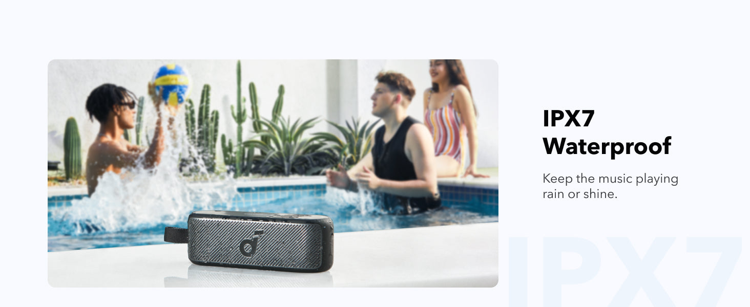 IPX7 Waterproof: Whether you're by the pool or at the beach, keep listening without limitations thanks to the IPX7 waterproof rating.