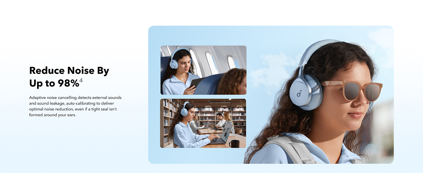 Reduce noise by up to 98%* with adaptive noise cancelling *Tested by soundcore under laboratory conditions
