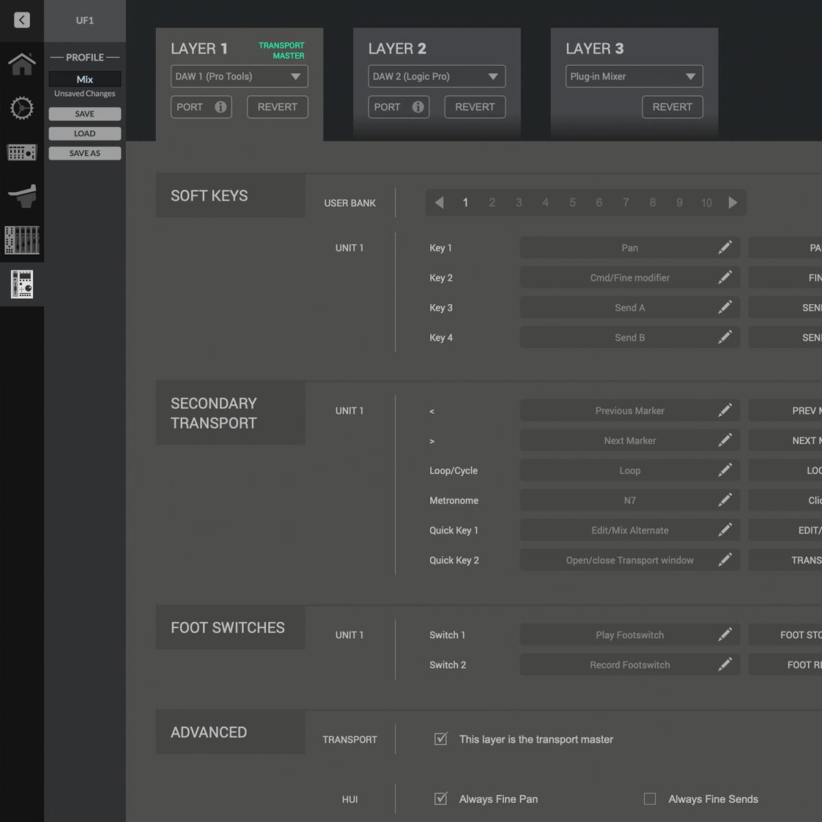 UF1 integrates with all major DAWs and includes workflow ready templates for Ableton® Live™, Cubase™/Nuendo™, Pro Tools®, Logic Pro®, Studio One®, LUNA™, Pyramix™, Mixbus™, REAPER™, Bitwig®,Digital Performer® , FL Studio® and Samplitude/Sequoia™ . Many producers and engineers prefer to split their creative process across multiple DAWs. UF1 is uniquely flexible and promotes SSL's Open DAW Policy - Control 3 different DAWs simultaneously and keep your production and mixdown process agile.