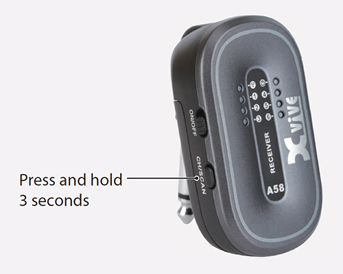 The A58 system offers a choice of six different wireless channels to choose from. But here’s the best part: it’s able to scan the available channels and automatically choose the one with the strongest, clearest signal! Each time you’re in a new venue, press the scan button on the receiver to find and set the best channel, and then set the transmitter to the the same one. When you turn off your transmitter and receiver between sets, and turn them on again, your most recent channel selection will be recalled.